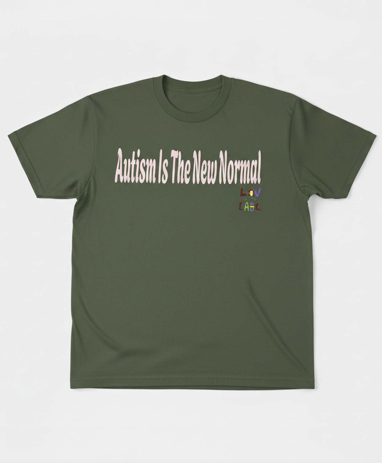 Centered, confident, and kind. This olive tee features the statement Autism Is The New Normal across the chest with a small Love Label mark for a clean, uplifting look. The fabric feels soft for everyday wear, and the smooth, low-texture print supports all-day comfort. Created with—and for—the autistic and broader neurodivergent community to affirm belonging in everyday life. Unisex, true-to-size fit (XS–5XL). Machine wash cold inside-out; tumble dry low or hang dry.